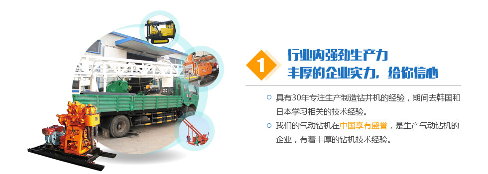 客戶共創雙贏。堅持科技先導、質量第一、信譽第一。讓我們用真誠的智慧共同締造事業的成功。讓我們用真誠的智慧共同締造事業的成功。希望與您的合作,能為我們的雙方共添輝煌。經營宗旨:質量求生存,信譽樹品牌,價格贏打井設備市場,創新圖發展。我們將以一流的技術換取您的信賴和欣慰。公司以人為本,廣納天下人才,技術力量雄厚。公司堅持以人為本,以優取勝,精誠服務,持續改進的質量方針和氣動鉆機服務宗旨。真誠地與